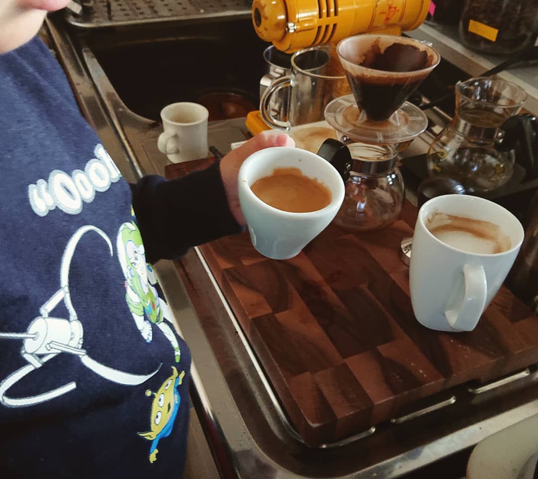 朝も息子がエスプレッソマシンに興味津々なので、一緒にダンピングして抽出。